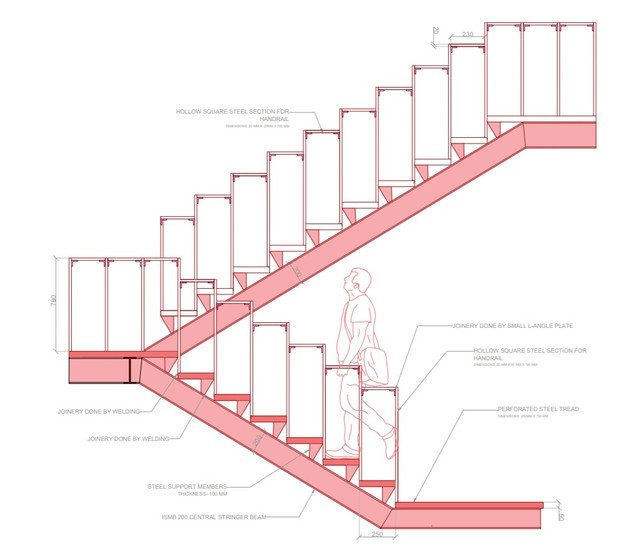 The staircase is a single central stringer beam steel staircase. The existing I beams of the structures could remain, when the wall is shifted behind, making the staircase being supported by these perpendicular I beams at certain points only. The tread is made of perforated steel sheets to allow light and ventilation. The handrail is a hollow square section which can be welded to the tread afterwards. Each tread is 250 mm X 750 mm everywhere, making it easy to produce it in masses.